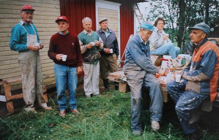 Tröskverkshuset / Mangelhuset talko i Kuni (Djupnäs). Fr. v. Bertel Wik, Sven Ivars, Bengt Vestergård, Sigfrid Mälsor, Alfred Grop, Rigmor Ivars och Ruben Örn. Siv Wik och Rigmor Ivars stod för kaffet. Rigmor sitter på "höiflakan" längst bort.