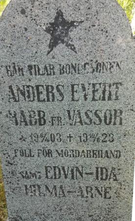 Evert Rabb avled efter en skottlossning i Ungdomsföreningens lokal på Lillön, Alfred Sundäng hade avlossat två skott utan avsikt att döda. Evert var son till Anders Rabb (Rabb-Ant) och Maria f. Åström som blev bönder på Källback hemman Norribyn. Barnen på gravstenen avled åren 1918-1919 då Spanska sjukan härjade. Dottern Ida gift med Ernst Rabb fortsatte på hemmanet. Gravstenen finns i Kvevlax.