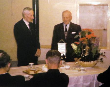Kvevlax Sparbanks styrelseordförande August Sundvik avtackar Otto Östman för en 45-årig förtroendemannagärning. År 1964