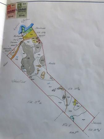 Kart över Vendla Smeds fastighet, Sidländ, troligen gjord på 1960-talet. Villaägarnas fastigheter finns antecknade.