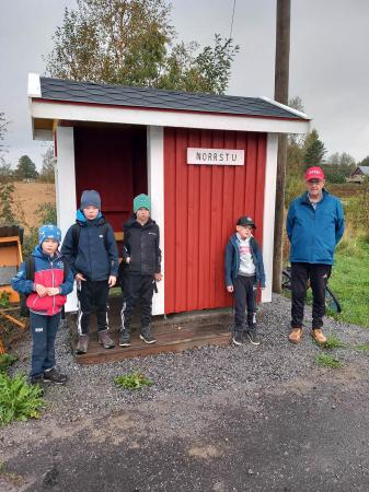 Busskur vid Norrstu, Brännbackvägen. Carl-Gustav Heir har byggt busskuren för barn som varje skoldag väntar på bussen vid Norrstu på väg till lågstadiet i Kvevlax och högstadiet i Smedsby. I Norrstu väntar 6 barn på bussen, vid Vesterbackvägen 7 och vid Löte 20. På bilden finns Carl-Gustav, som byggt kuren efter modell från Kalajoki, längst till höger.