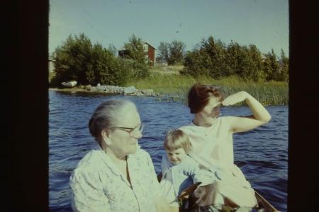 I båten längst fram sitter Irene Hinders. Längst bak Gunvor Svarvar med dottern Catarina Svarvar. I bakgrunden Josefina Örns stuga på Bodstranden. Sommaren 1967.