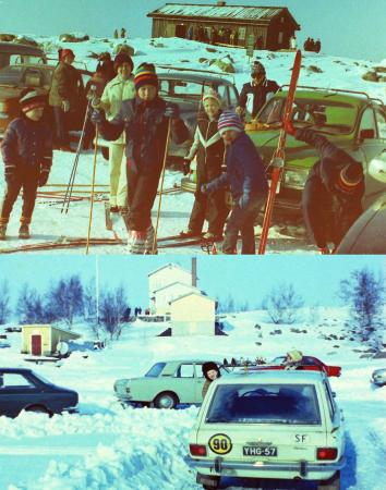 Isvintrarna under 1970-talet gav möjlighet att ploga vägar till sjöbevakningsstationerna i Valsörarna (den övre bilden) och Mickelsörarna (den nedre bilden). Dessa blev populära utflyktsmål. Av barnen ålder att döma bör tiden vara början av 70-talet. Mazdan i nedre bilden var Viking Åbergs och var registrerad som paketbil, men fick ha en hård bakåtvänd bakbänk för passagerare.