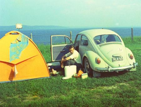 Camping var ett populärt ressätt på 1960- och 1970-talen. Det gav frihet med en låg budget. Ett kupoltält kunde rymma fyra personer och var lätt att slå upp. Maten gjordes i förväg eller på ett spritkök på en parkeringsplats och kompletterades med inköp i någon matbutik längs vägen. Bilden där Viking Åberg sitter framför tältet är tagen i Danmark 1969. Familjen gjorde med sina två söner utfärder till Paris, Österrike, Nordkap, finska Lappland, Sverige, Södra och Östra Finland. Att hyra en stuga hände någon gång, men var ett undantag, det kostade och man var bunden av tider. Senare skaffades ett större tält med fönster. På en campingplats i Belgien skar någon sönder tältfönstret då vi låg och sov. Vi tyckte det var obehagligt och körde kortaste vägen hem. Fönstret reparerades i Kuopio, men tältet restes aldrig mer. Campingtiden var för vår del över.