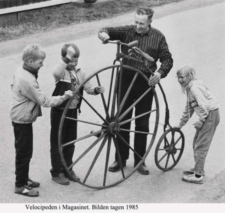 Alf Svahn demonstrerar 1985 muséets velociped från slutet av 1800-talet för Glenn Holms, Fredrik Ahlman och Anne Holms. Velocipeden härstammar från Vassor och är möjligen tillverkad av John Wickström. Text: Kv. hemb.