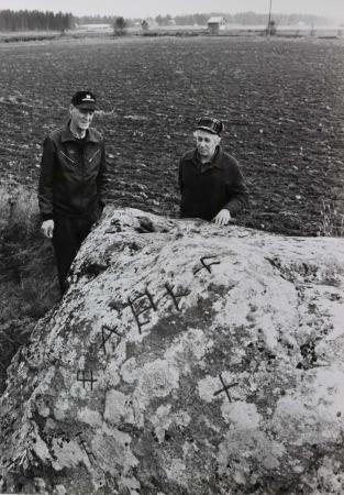 Levi Almén och Alf Svahn (Kvevlax Hembygdsförening) har restaurerat rårösen från 1751 mellan Kvevlax, Västerhankmo (skall det vara Österhankmo?) och Vassor. Alla ristade bomärken har putsats fram och förtydligats med färg 1992. Bilden är från Påksholmen 1992. Text: Kv. hemb.