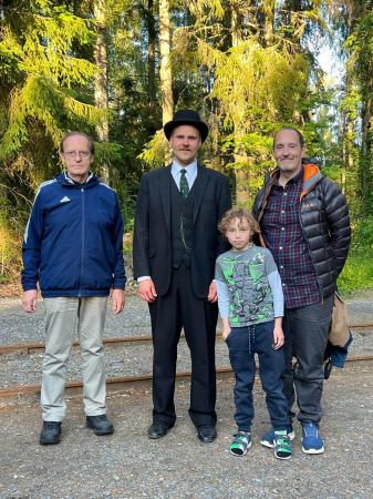 Kristian Sellberg (t.v.), hans son Johan Sellberg och sonson Sigurd Sellberg såg föreställningen "Maskinisterna" i Närpes sommaren 2025. Kristian är John Wickströms dotterson. I mitten står Simon Nysten som i föreställningen föreställde John Wickström. Se en kort video: Läs mera...