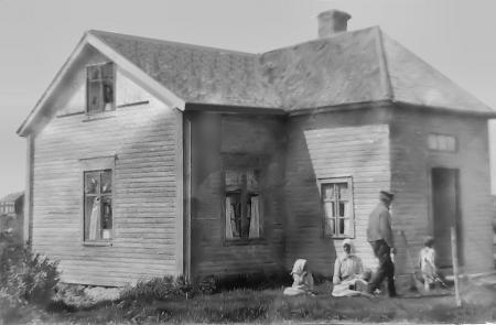 Hellaris på Källbacken Norribyn. Från vänster: Gerda Åberg f. Udd 1908, Gerdas moster Beata Södergård f. 1876 gift 1916 med Mickel Örn i Kunisund, Gerdas morfar Jakob Södergård f. 1837 och Gerdas bror Rafael Åberg f. 1911. Jakob byggde stugan ca. 1905 sedan han sålt hemmanet på Källbacken.
