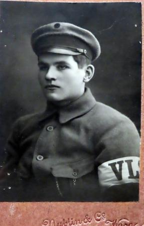 Johannes Frantz i skyddskårsuniform. Johannes är född 1901 i Vassor. Han emigrerade till USA och gifte sig med Rose. De besökte hemgården 1951 och hade då filmkamera med. Hans far är Karl Frantz född 1871 på torpet Frans under Tottesunds boställe. År 1901 övertar Karl Smeds militärboställe i Vassor. Han och sönerna Teodor och Ernst inlöser senare delar av bostället. Han gifte sig med Maria Josefina Fors och bodde några år på bostället hos sin svärfar Anders Fors där de tre äldsta barnen är födda. Efter Josefinas död 1918 gifte han sig med Johanna Östman (Bjynis). På andra bilder finns Karl tillsammans med sin bror Johannes Frantzén i rysk militärunifor.
