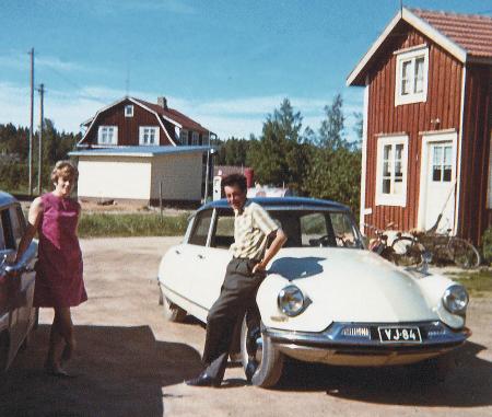 Gusten Frantz står lutad mot Håkan Lundbergs Citroén Ds 19 och Maj-Lis Lundberg (Håkans hustru) står bredvid Gustens Mercedes. Bilden är tagen utanför Elis Örns stuga med Emil Rabbs stuga på Löte i bakgrunden. Där syns också en del av bensinpumpen och cisternen. Pumpen fungerade så att fem liter bensin per gång pumpades upp och släpptes sedan ned längs slangen till bilens tankningslucka.