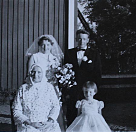 Bröllop mellan Alfons Ivars f.1932 och Maj-Britt Storbacka f.1938. Med på fotot finns Alfons mor Ida Ivars f. Södergård på Västerbacken. och en okänd flicka.